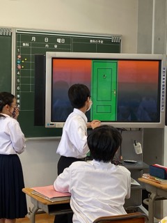 さあ、今度は生徒の2人が代表として、ウェスリーと塚﨑先生からの課題(質問)に英語で答えます。2問ともクリアーしたら、ハロウィンの扉へご招待です。