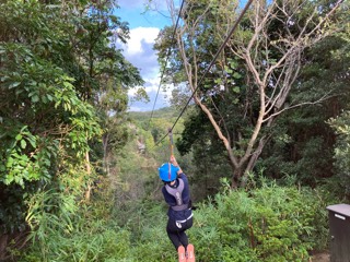 池の上を滑空するジップラインは、気分最高です。今から復路にチャレンジです。