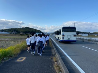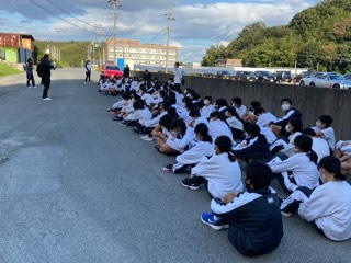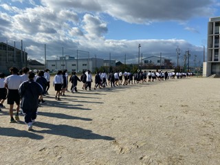 津波発生を想定した二次避難を1年生が実施しました。グラウンドへの一時避難に続き、二次避難場所は高台である四日市北警察署南側。2年生・3年生は昨年度実施済。富田中学校からは片道40分1年生みんなで歩きました。事前に二次避難の目的を伝えてもいらっているため行動も大変スムーズでした。