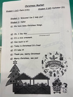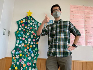 毎時間、子どもたちのコミュニケーションスキル向上を目指し教材を工夫するなど一生懸命に取り組んでくれています。1年生の授業「Christmas Market」。Christmasに係わる英単語を学習し、一人ひとり買い物をします。ウェスリー手作りのツリーにデコレーションをしていきます。教室は心があったかくなる雰囲気でした。