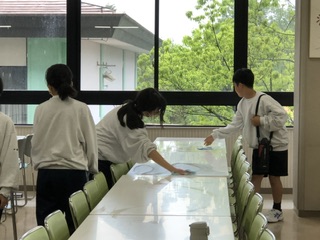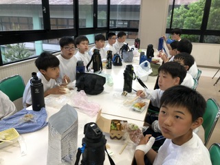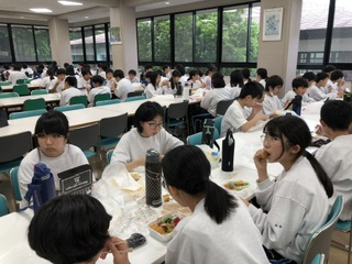 大縄跳びの後は、いつもの給食とは違うお弁当の昼食です。ご準備いただきありがとうございました。子ども達は、みんなとても美味しそうに食べていました。食後は、係生徒が机を拭き、椅子が戻っているか確認します。