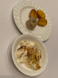 次の料理は、玉ねぎ焼売とポテト、ショートパスタのクリームグラタンです。