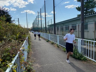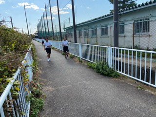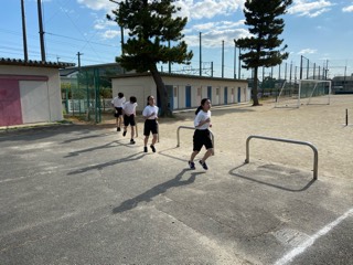 保健体育授業では体づくり運動を大切にしています。体育祭でも披露した「リズム体操」、主運動にスムーズにつなげるために「5分間走や外周ランニング」などの体力を高める運動を継続しています。どの学年もみんな一生懸命に取り組んでいます。