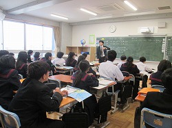 どのようなことが違反になるのかを具体的に例を出して説明を行いました。また、下校時の自転車と徒歩の生徒の歩き方などの確認も行われました。校門を出て1号線を渡るまでは、自転車を押して歩いていくほうが安全だと警察からの助言も伝えました。