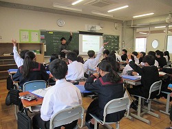 1限目の様子です。1年生は生活学習アンケートに答えていました。3年生理科では、細胞分裂について、一人ひとりの予想をタブレットに書き込み、他の生徒の意見も一目でわかるように発表ノートで一覧に示していました。自分の考えはどうかなと思っている生徒もその書き込みをみながら、周りの生徒と意見交換をすることができるようです。