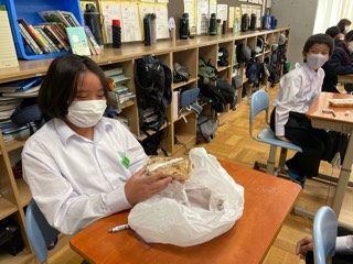 期末テスト1日目、1年生の帰り学活では「炊き出し用五目ご飯、わかめご飯の持ち帰り」がありました。例年、2年生の炊き出し訓練時に全校生徒分の持ち帰り用ご飯を用意しています。今年度はコロナ禍の密を避けるため、学校業務アシスタントの渡邉さん、打田さんを中心に教職員で準備したものを1年生全員に配布しました。