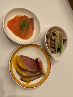 今晩の最初の料理は、合鴨のパストラミと淡路産いちじく、シルバーサーモンのマリネ、神戸産プレミアムポークの冷製しゃぶしゃぶです。