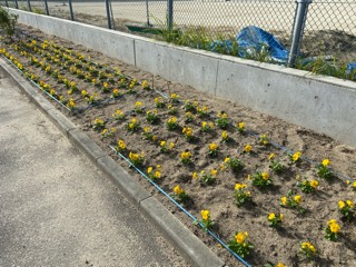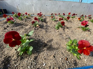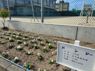 富田中学校のテニスコート側花壇。学校支援員の棚瀬 護さんがほぼ毎日手入れをしていただいている花壇です。11月に入り、赤・白・黄色など6色のパンジーの花苗を一面にきれいに植えられていただきました。朝から色とりどりのきれいなパンジーが子どもたちをあたたかく迎えてくれます。富中は多くの地域のみなさんに支えられています。そして美しい学校環境を整えてくれています。わたしたちも自分たちの手で美しい学校環境・学習環境を整えていきたいですね。棚瀬さんいつもありがとうございます。