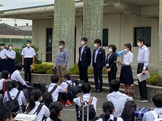 おはようございます。いよいよ修学旅行の始まりです。112名時間通りに集合し、出発式が無事始めることができました。実行委員さんのことばからもあるように、ルールとマナーを守ってみんなで楽しい修学旅行を迎えましょう