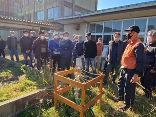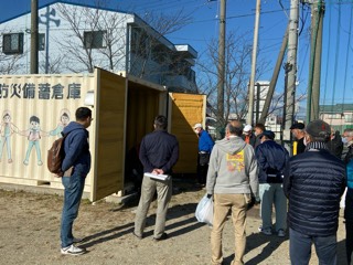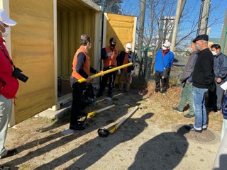 【グラウンドにある防災倉庫にある備品説明から。自主防災隊のみなさんが月に1回の点検をしていただいています】