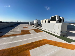 【教室棟の屋上です。中学生も緊急時の二次避難場所として活用します。ここには太陽光発電のソーラーパネルが設置されています。】