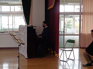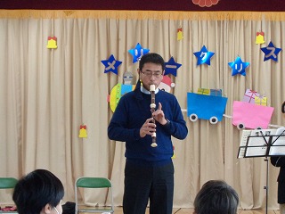 富田中校区の『学びの一体化』として、小学校・幼稚園との交流を進め、常に連携しあっています。本日は富田幼稚園交流として、本校の音楽科教員の「フルート演奏」と学校長の「アルトリコーダー・ピアノ・歌」のコラボでの生演奏を披露しました。