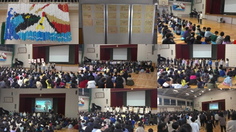 終業式では,私から,2学期のよかった様子を連絡表の所見の中から,「声に出してあいさつ」,冬休みに向けての話(安全面,計画的な学習,生活リズムなど)をしました。続いて代表委員会から,冬休みの生活について,伝えてもらいました。