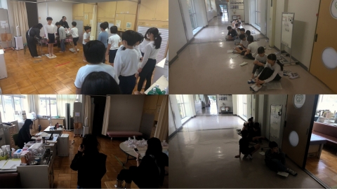第二次避難では、「おなし・はしらない・しゃべらない・もどらない」「お・は・し・も」の確認とともに、職員には、教室やトイレに人が残っていないか確認してきたか聞きました。また、避難時の体勢として、左手で右腕を持ち、右手にハンカチを持ち、口をふさぐように伝えました。