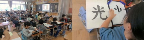 手本を見ながら,筆遣いや配置に気を付けて書いていました。
