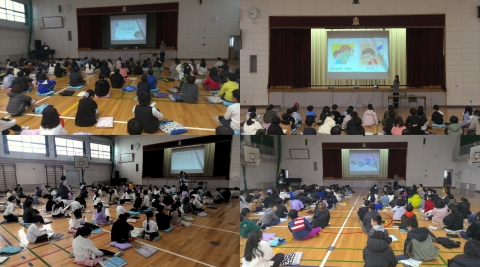 学級活動の時間に,大きさの違う紙飛行機を2つ作って,体育館に集まりました。