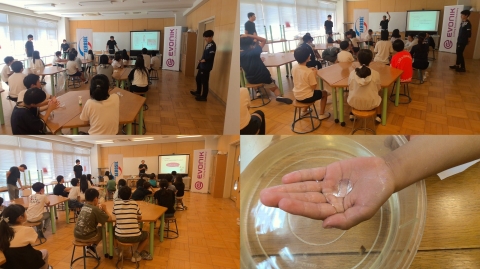 半導体の生産量が全国で1位であること、「シリカ」という粉末の性質を実験をしたり、それがどんな製品に使われているのかを説明してもらったりしました。