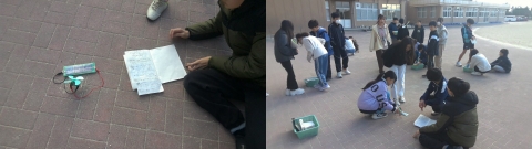 今日は、太陽電池を使って、外に出て、太陽光を当てるとモーターが回るのか実験をしました。