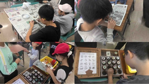 マグネットづくりは、薄い円柱状で牛乳瓶のふたぐらいの大木の木片の表面をやすり削ってつるつるの表面にし、そこに、お気に入りの動物や植物などのスタンプを一つ選んで押し、そこに色鉛筆で色を塗って完成です。