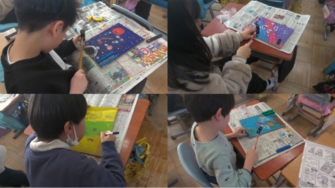 今日の活動では、多くの子が板に書いた下描きに色を塗っていました。