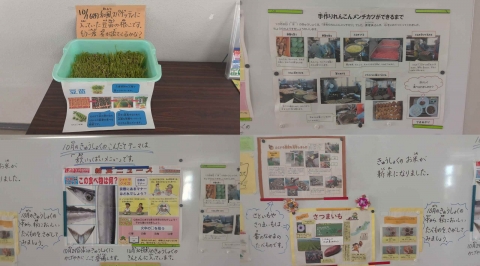 この掲示には、お米が新米になったこと、手作りメンチカツができるまでの工程が写真で説明されていました。