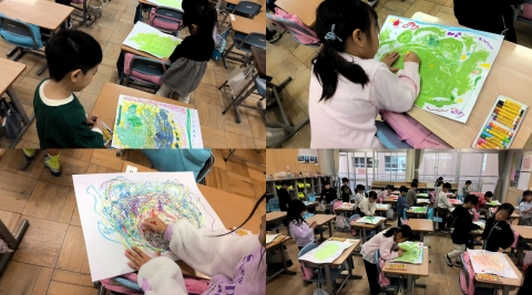 その後,できあがった形を何かに見立てて,クレヨンで書き加えるといういわゆる「即興表現」の活動でした。