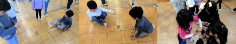 教室に入ってみると、机やいすが端に固められ、子どもたちは教室の真ん中でこま回しに挑戦していました。