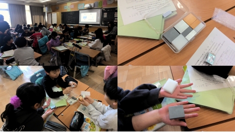 今日は同じ大きさの4つの教具を使って、重さを図る実験をしました。