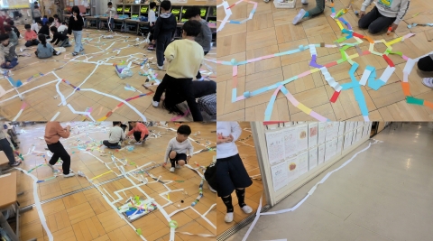 3時間目に切った紙をみんなでつなげていました。