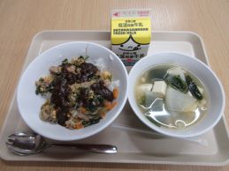 今日の献立は、三重豚のビビンバ、豆腐とわかめのスープ、牛乳でした。