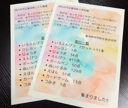 All donated items were delivered to the NPO Mottainai Japan and the NPO Arigatou Book.