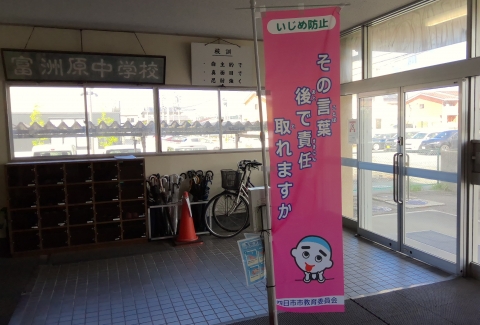 Noviembre es el Mes de Refuerzo para la Prevención del Acoso Escolar en la prefectura de Mie. En nuestra escuela, hemos colocado en la entrada un estandarte de prevención del acoso escolar enviado por la Junta de Educación de la Ciudad de Yokkaichi. Hoy también distribuimos el folleto titulado “Por nuestros niños y niñas insustituibles.” El folleto explica la definición del acoso escolar, las tendencias recientes, el aumento del acoso mediante teléfonos inteligentes y otros dispositivos, así como las señales que pueden indicar que un estudiante está siendo acosado. Le pedimos que lo lea atentamente.