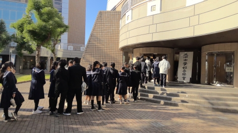 At 9:20 on Friday, November 14, we arrived at Ai-Ai Hall in Kawagoe Town, the venue for the 65th Sanshi Junior High School Music Festival. It took exactly 30 minutes to walk from the school. Inside the venue, some schools were doing vocal warm-ups, which was quite overwhelming, but our students had already completed their warm-ups at school. Photography inside the hall is prohibited, so we cannot post any photos of the program from this point onward.