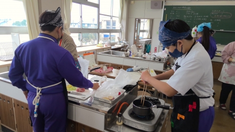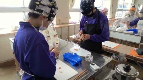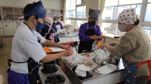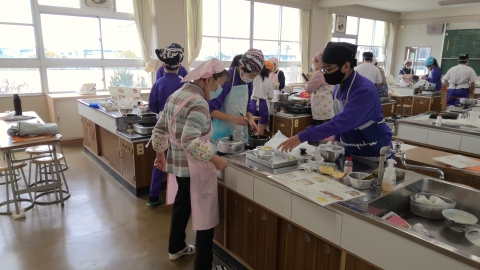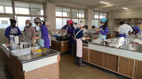 On the morning of Monday, January 26, first-year students are taking part in a home economics cooking class in the cooking room. We are receiving cooperation from the Health Mates (Dietary Improvement Promotion Volunteers).