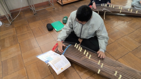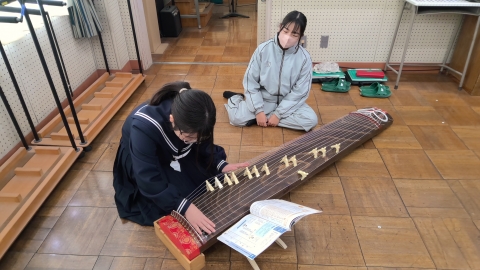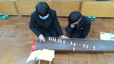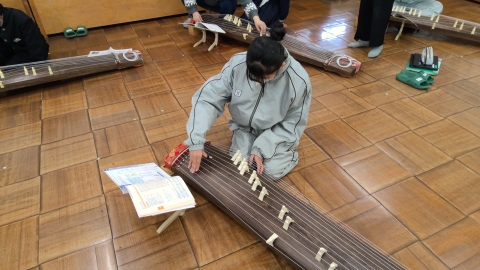 On Monday, January 26, during the 3rd and 4th periods, half of Class 1-B is playing the koto in the music room. At that time, they were learning a technique called “oshide”, which is used to produce the highest note in “Sakura Sakura.”
