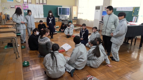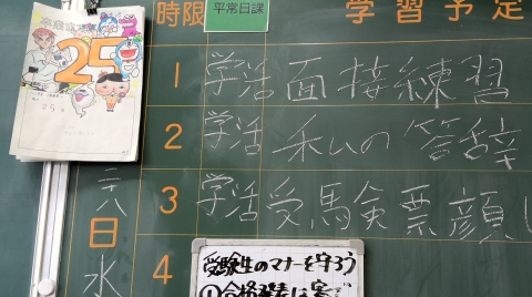 सामान्य कक्षा सञ्चालन हुँदैन। त्यसको सट्टा, विद्यार्थीहरूले आफूले रोजेको अध्ययन, ट्याब्लेट प्रयोग गरी स्नातक उत्तर भाषण (答辞) को निबन्ध लेखन, अन्तर्वार्ता अभ्यास, र प्रान्तीय उच्च विद्यालयको प्रारम्भिक छनोट परीक्षा केन्द्रमा कसरी जाने भन्ने विषयमा अध्ययन गरिरहेका छन्।