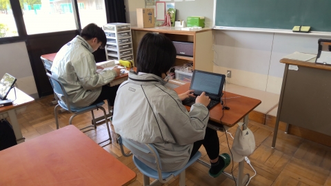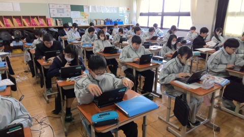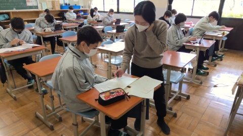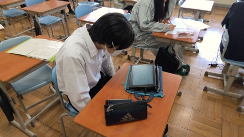 No regular classes are being held. Instead, students are working on self-selected study activities, writing the graduation reply speech on tablets, practicing for interviews, and researching how to get to the venues for the first-stage selection of prefectural high schools.