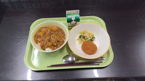The school lunch on Friday, January 30 consisted of Mie pork curry rice served in a bowl, menchi-katsu, and Mie bamboo shoot salad. This week’s school lunches were planned with consideration for the SDGs.