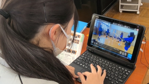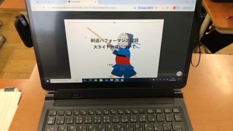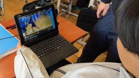 On Monday, February 2, in first-year health and physical education class, students were working in the classroom on a kendo performance-based assignment. In this assignment, students objectively review videos of their own performance, compare them with a model video, and think about their strengths and areas for improvement. The goal is to clearly communicate these reflections using slides.