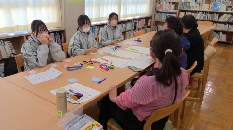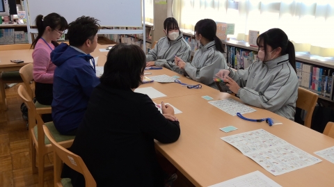 After school on Wednesday, February 4, six first-year students are participating in the “Meeting to Hear Junior High School Students’ Opinions,” which is being held in the school library. This meeting is organized by members of the Yokkaichi City Assembly’s Special Committee on the Investigation of the Children’s Rights Ordinance, etc., which aims to establish Yokkaichi City’s Children’s Rights Ordinance. The committee members listen to opinions from high school and junior high school students. Today, eight committee members are visiting the school.