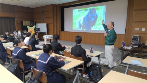 Chúng tôi đang tham gia chương trình trải nghiệm tại Vườn thú và Vườn bách thảo Higashiyama mang tên “Suy nghĩ về đa dạng sinh học tại sở thú” cùng với 27 học sinh thuộc 6 nhóm. Người thuyết trình là một bác sĩ thú y của Vườn thú và Vườn bách thảo Higashiyama. Chúng tôi được biết rằng đa dạng sinh học gồm ba loại: đa dạng di truyền, đa dạng loài và đa dạng hệ sinh thái.