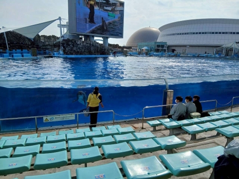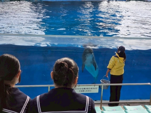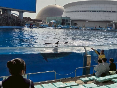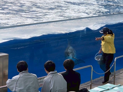 At the Nagoya Port Aquarium, the dolphin show schedule was changed, so the experiential program started 30 minutes earlier than planned. Looking closely at the slides, we could read words such as “artificial objects washed ashore on Japan’s coasts” and “examining dead sea turtles.”