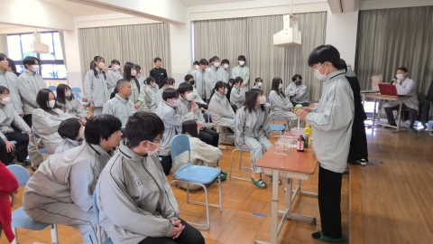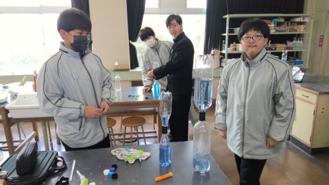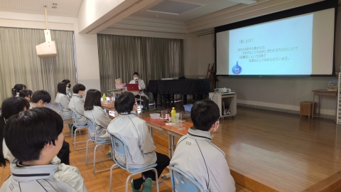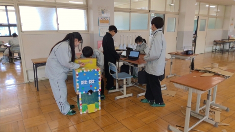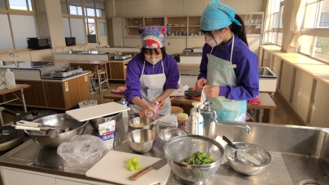 Monday, February 16. First-year students are following a special timetable and are working on research activities throughout the entire day starting from the first period. Some groups are conducting experiments in the science laboratory, others are developing menus in the cooking room, and some groups are going out of school after making prior arrangements to conduct interviews. There are also groups carrying out fieldwork.