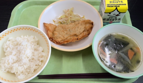 The school lunch on Thursday, February 19 consists of Tsu gyoza, namul, Chinese-style soup made with plenty of locally grown ingredients, rice, and milk. Tsu gyoza, which has become famous as a “B-grade gourmet” dish, was originally developed as a menu item for school lunches in Tsu City.