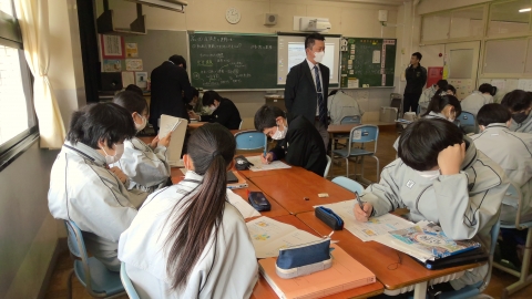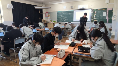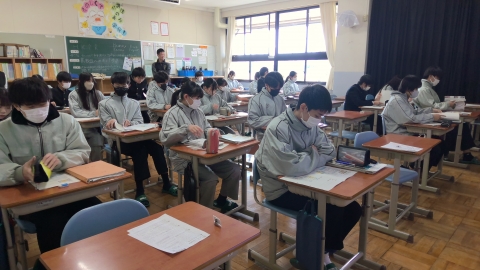 El viernes 20 de febrero, en la clase de estudios sociales, los estudiantes de tercer año están aprendiendo sobre los estados financieros, que pueden considerarse como el boletín de calificaciones de una empresa. Están utilizando materiales didácticos elaborados por el Instituto Japonés de Contadores Públicos Certificados con la colaboración del periódico Japan Education Press. En nuestra escuela, esta clase se lleva a cabo a solicitud de dicho instituto.