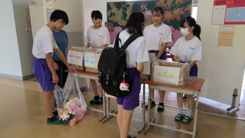 9月24日(水)朝、生徒会による寄付活動が続いています。絵本、ぬいぐるみ、文房具などたくさんのモノが集まってきています。寄付は10月2日(木)まで行います。