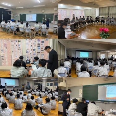 2年生が、12月4日に続いて、上越教育大学附属中学校との連携授業の2回目を行いました。今回は、上越教育大学から、中平教授、大学院生の総勢9名の方が、新潟から授業のサポートのために来校されました。オンラインで新潟水俣病の語り部の方のお話を聞き、その後、16グループに分かれ、両校で感想や意見の交換を行いました。子どもたちは語り部の方のお話をしっかりと聴き、語り部の方の思いや願いを受け取って、自分・自分たちに何ができるのかを真剣に考えていました。