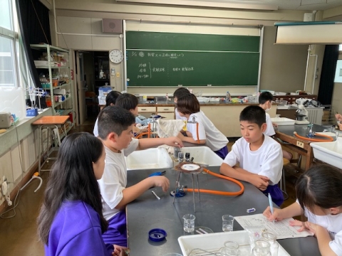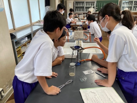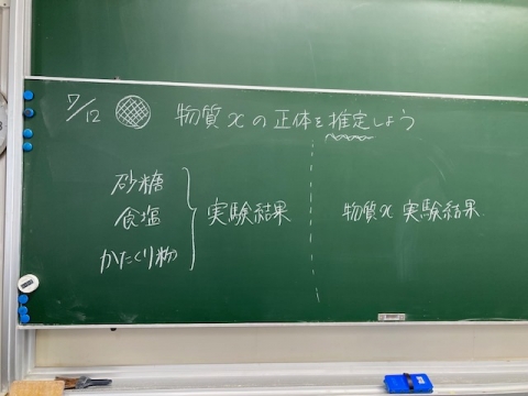 7月12日(金)、1年生の理科です。3種類の白い粉末(砂糖・食塩・かたくり粉)があります。前の授業で自分たちで考えた実験方法で実験しています。