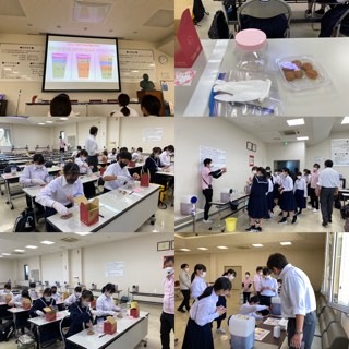 梅干作りの方法を教えていただき、手袋をして早速梅干を作ります。梅干を漬けるタレを、酸っぱさ、甘さなどを考え、自分好みの味付けにプレンドします。その液と梅干を容器に入れて密封します。出来上がりは6月7日です。楽しみですね。
