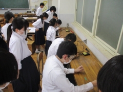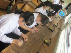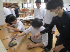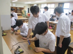 3年生の技術の授業で、はんだづけをしていました。基盤にはんだを流しこむ練習ですが、なかなかはんだが溶けづに苦労している生徒、初めてにしては上手にできている生徒など様々でした。もちろん安全面の配慮として、髪の毛の長い生徒は、髪の毛が垂れて焦げたり燃えたりしないようしっかり束ねています。場面によって、服装や髪形を考えることは大切ですね。